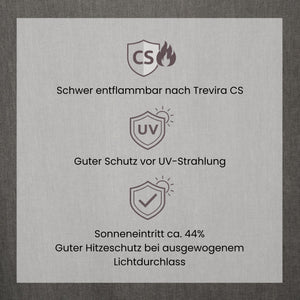 SOL besteht aus 100 % Polyester Trevira CS und ist damit schwer entflammbar und flammhemmend – ein entscheidender Vorteil für den Einsatz in öffentlichen und gewerblichen Räumen. Der Stoff ist semi-transparent, angenehm leicht und fällt weich. Abschluss unten: Saum bei Masskonfektion. Einsprung unter 1 %.