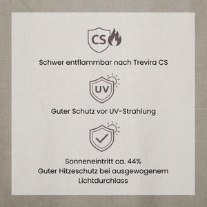 SOL besteht aus 100 % Polyester Trevira CS und ist damit schwer entflammbar und flammhemmend – ein entscheidender Vorteil für den Einsatz in öffentlichen und gewerblichen Räumen. Der Stoff ist semi-transparent, angenehm leicht und fällt weich. Abschluss unten: Saum bei Masskonfektion. Einsprung unter 1 %.