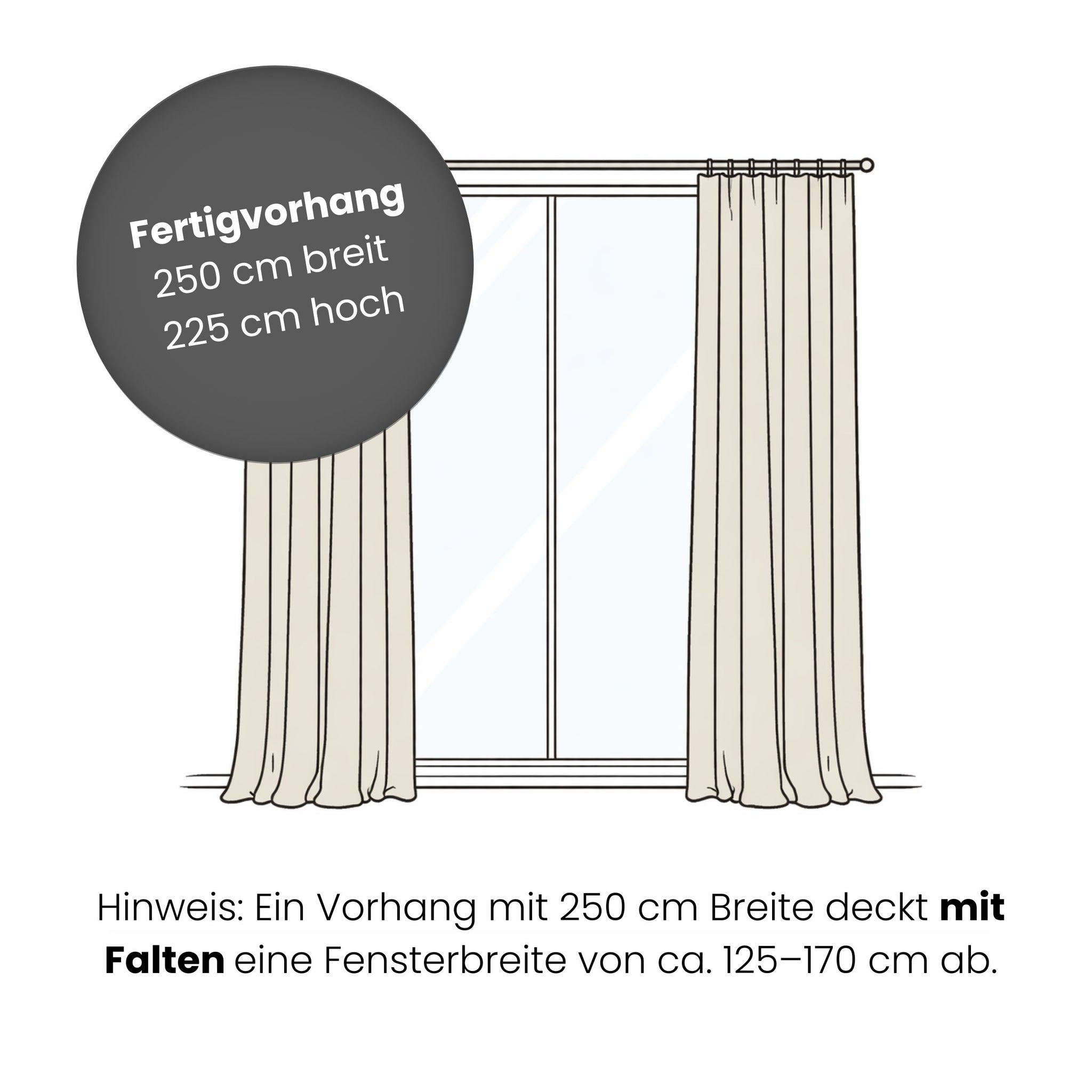 Ein Vorhang mit 250 cm Breite deckt mit Falten eine Fensterbreite von ca. 125–170 cm ab.